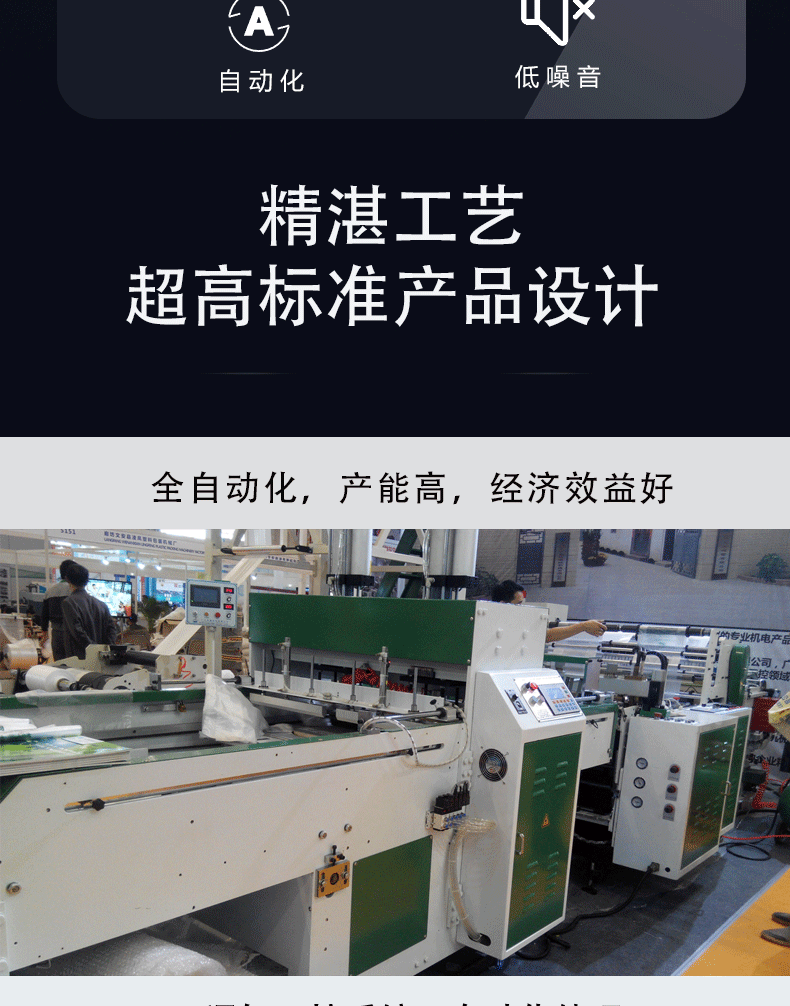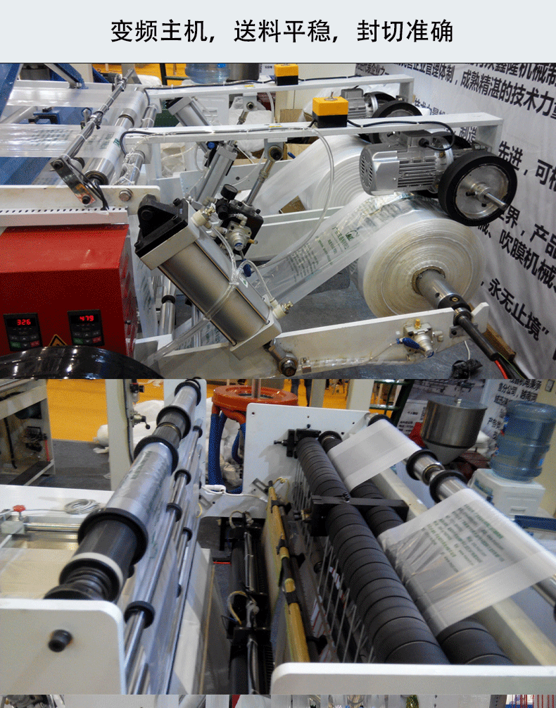 *主機采用變頻器調速,自動送料,配自動糾偏裝置,使制袋平穩(wěn),封切準確。