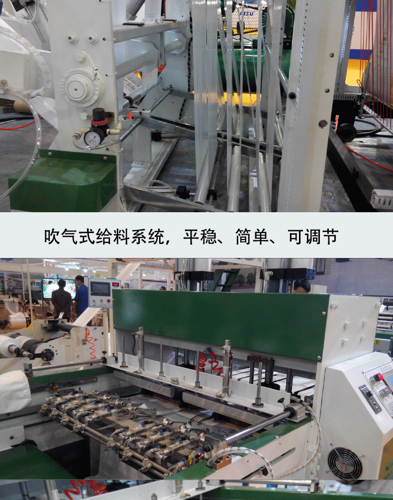 *吹氣式出料系統(tǒng),袋底整型設計,自動沖床采用油壓控制,廢料集中輸送收集,易于整理,操作簡單,具有無料、斷料、堵料自動停機功能。